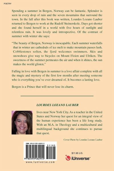Spending a summer in Bergen, Norway can be fantastic. Splendor is seen in every drop of rain and the seven mountains that surround the town. In the fall after this book was written, Lourdes Lozano Lauber returned to Bergen to work at the Rudolf Steinerskole. Days got shorter and she found herself in a world with five hours of sunlight and relentless rain. It was lovely and introspective. Of the contrast of summer with winter she says: "The beauty of Bergen, Norway is inescapable. Each summer waterfalls that in winter are cathedrals of ice melt to make mountain passes lush. Cobblestones soften, the fjord welcomes swimmers. Skis and snowshoes give way to bicycles on Mount Floien and Ulriken. The sweetness of the summer permeates the air and when it shines, the sun makes the world glisten." Falling in love with Bergen in summer is a love affair complete with all the magic and mystery of the first few months after meeting someone who is everything you've ever dreamed of. It becomes a lasting love. Bergen is a Prince that will never lose its charm.