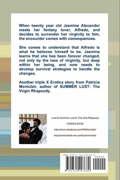 When twenty year old Jasmine Alexander meets her fantasy lover, Alfredo, and decides to surrender her virginity to him, the encounter comes with consequences. She comes to understand that Alfredo is what he believes himself to be. Jasmine learns that she has been forever changed, not only by the loss of virginity, but deep within her being, and now needs to develop survival strategies to handle the changes. Another triple X Erotica story from Patricia Montclair, author of SUMMER LUST: The Virgin Rhapsody.