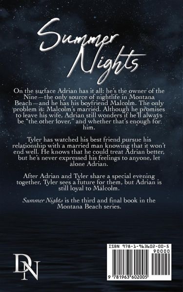 On the surface Adrian has it all: he's the owner of the Nine-the only source of nightlife in Montana Beach-and he has his boyfriend Malcolm. The only problem is: Malcolm's married. Although he promises to leave his wife, Adrian still wonders if he'll always be "the other lover," and whether that's enough for him. Tyler has watched his best friend pursue his relationship with a married man knowing that it won't end well. He knows that he could treat Adrian better, but he's never expressed his feelings to anyone, let alone Adrian. After Adrian and Tyler share a special evening together, Tyler sees a future for them, but Adrian is still loyal to Malcolm. Summer Nights is the third and final book in the Montana Beach series.