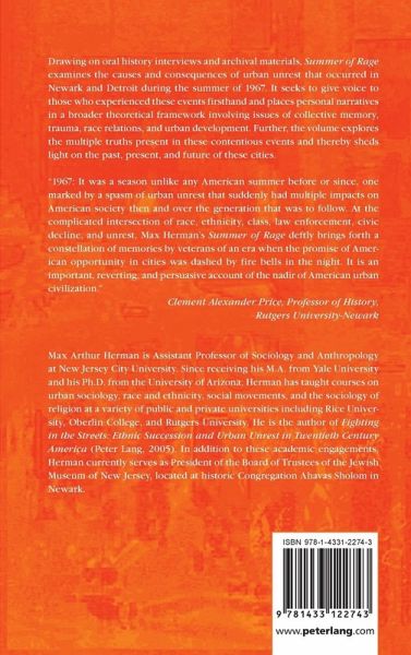 «1967: It was a season unlike any American summer before or since, one marked by a spasm of urban unrest that suddenly had multiple impacts on American society then and over the generation that was to follow. At the complicated intersection of race, ethnicity, class, law enforcement, civic decline, and unrest, Max Herman's 'Summer of Rage' deftly brings forth a constellation of memories by veterans of an era when the promise of American opportunity in cities was dashed by fire bells in the night. It is an important, reverting, and persuasive account of the nadir of American urban civilization.» (Clement Alexander Price, Professor of History, Rutgers University-Newark)