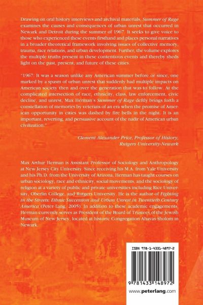 «1967: It was a season unlike any American summer before or since, one marked by a spasm of urban unrest that suddenly had multiple impacts on American society then and over the generation that was to follow. At the complicated intersection of race, ethnicity, class, law enforcement, civic decline, and unrest, Max Herman's 'Summer of Rage' deftly brings forth a constellation of memories by veterans of an era when the promise of American opportunity in cities was dashed by fire bells in the night. It is an important, reverting, and persuasive account of the nadir of American urban civilization.» (Clement Alexander Price, Professor of History, Rutgers University-Newark)