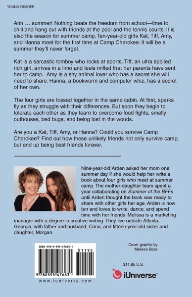 Ahh . summer! Nothing beats the freedom from school - time to chill and hang out with friends at the pool and the tennis courts. It is also the season for summer camp. Ten-year-old girls Kat, Tiff, Amy, and Hanna meet for the first time at Camp Cherokee. It will be a summer they'll never forget. Kat is a sarcastic tomboy who rocks at sports. Tiff, an ultra spoiled rich girl, arrives in a limo and feels miffed that her parents have sent her to camp. Amy is a shy animal lover who has a secret she will need to share. Hanna, a bookworm and computer whiz, has a secret of her own. The four girls are tossed together in the same cabin. At first, sparks fly as they struggle with their differences. But soon they begin to tolerate each other as they learn to overcome food fights, smelly outhouses, bed bugs, and being lost in the woods. Are you a Kat, Tiff, Amy, or Hanna? Could you survive Camp Cherokee? Find out how these unlikely friends not only survive camp, but end up being best friends forever.