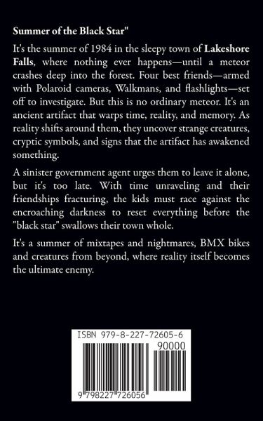 Summer of the Black Star" It's the summer of 1984 in the sleepy town of Lakeshore Falls, where nothing ever happens-until a meteor crashes deep into the forest. Four best friends-armed with Polaroid cameras, Walkmans, and flashlights-set off to investigate. But this is no ordinary meteor. It's an ancient artifact that warps time, reality, and memory. As reality shifts around them, they uncover strange creatures, cryptic symbols, and signs that the artifact has awakened something. A sinister government agent urges them to leave it alone, but it's too late. With time unraveling and their friendships fracturing, the kids must race against the encroaching darkness to reset everything before the "black star" swallows their town whole. It's a summer of mixtapes and nightmares, BMX bikes and creatures from beyond, where reality itself becomes the ultimate enemy.
