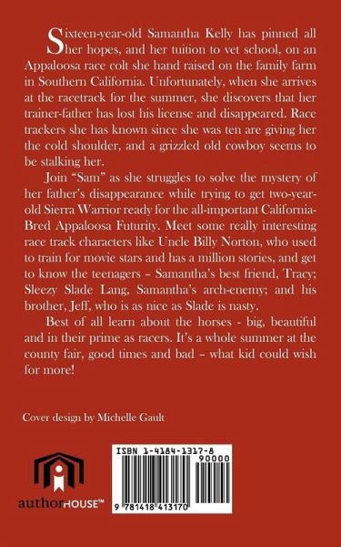 Sixteen-year-old Samantha Kelly has pinned all her hopes, and her tuition to vet school, on an Appaloosa race colt she hand raised on the family farm in Southern California. Unfortunately, when she arrives at the racetrack for the summer, she discovers that her trainer-father has lost his license and disappeared. Race trackers she has known since she was ten are giving her the cold shoulder, and a grizzled old cowboy seems to be stalking her. Join "Sam" as she struggles to solve the mystery of her father's disappearance while trying to get two-year-old Sierra Warrior ready for the all-important California-Bred Appaloosa Futurity. Meet some really interesting race track characters like Uncle Billy Norton, who used to train for movie stars and has a million stories, and get to know the teenagers - Samantha's best friend, Tracy; Sleezy Slade Lang, Samantha's arch-enemy; and his brother, Jeff, who is as nice as Slade is nasty. Best of all learn about the horses - big, beautiful and in their prime as racers. It's a whole summer at the county fair, good times and bad - what kid could wish for more!
