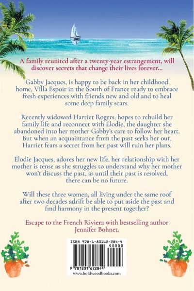 A family reunited after a twenty-year estrangement, will discover secrets that change their lives forever...Pre-order the brand new escapist summer read from international bestseller Jennifer Bohnet! Gabriella Jacques, is happy to be back in her childhood home, Villa Espoir in the South of France ready to embrace fresh experiences with friends new and old and to heal some deep family scars. Recently widowed Harriet Rogers, hopes to rebuild her family life and reconnect with Elodie, the daughter she abandoned into her mother Gabby's care to follow her heart. But when an acquaintance from the past seeks her out, Harriet fears a secret from her past will ruin her plans. Elodie Jacques, adores her new life in her Grandmothers old home as a freelance journalist. Her relationship with her mother is tense as she struggles to understand why her mother won't talk to her about the past, as until their past is resolved, there can be no future. Will these three women, all living under the same roof after two decades adrift be able to put aside the past and find harmony in the present together?