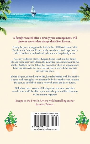 A family reunited after a twenty-year estrangement, will discover secrets that change their lives forever...Pre-order the brand new escapist summer read from international bestseller Jennifer Bohnet! Gabriella Jacques, is happy to be back in her childhood home, Villa Espoir in the South of France ready to embrace fresh experiences with friends new and old and to heal some deep family scars. Recently widowed Harriet Rogers, hopes to rebuild her family life and reconnect with Elodie, the daughter she abandoned into her mother Gabby's care to follow her heart. But when an acquaintance from the past seeks her out, Harriet fears a secret from her past will ruin her plans. Elodie Jacques, adores her new life in her Grandmothers old home as a freelance journalist. Her relationship with her mother is tense as she struggles to understand why her mother won't talk to her about the past, as until their past is resolved, there can be no future. Will these three women, all living under the same roof after two decades adrift be able to put aside the past and find harmony in the present together?