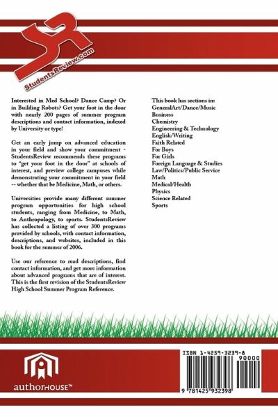Interested in Med School? Dance Camp? Or in Building Robots? Get your foot in the door with nearly 200 pages of summer program descriptions and contact information, indexed by University or type! Get an early jump on advanced education in your field and show your commitment - StudentsReview recommends these programs to "get your foot in the door" at schools of interest, and preview college campuses while demonstrating your commitment in your field -- whether that be Medicine, Math, or others. Universities provide many different summer program opportunities for high school students, ranging from Medicine, to Math, to Anthropology, to sports. StudentsReview has collected a listing of over 300 programs provided by schools, with contact information, descriptions, and websites, included in this book for the summer of 2006. This book has sections in: GeneralArt/Dance/Music Business Chemistry Engineering & Technology English/Writing Faith Related For Boys For Girls Foreign Language & Studies Law/Politics/Public Service Math Medical/Health Physics Science Related Sports Use our reference to read descriptions, find contact information, and get more information about advanced programs that are of interest.This is the first revision of the StudentsReview High School Summer Program Reference.
