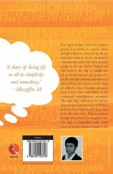For Sanil Sachar, a poet by passion, poetry is a means to express those thoughts that one does not speak out loud but wants to-it is a medium to communicate and reach out to as many people as one can. Summer Promises and Other Poems is not only an insight into the poet's life but also his perspective on life and the various experiences it off ers. His poems traverse a wide range of subjects, from everyday emotions such as love, fame and failure to the occasional transformative moment. Th rough t