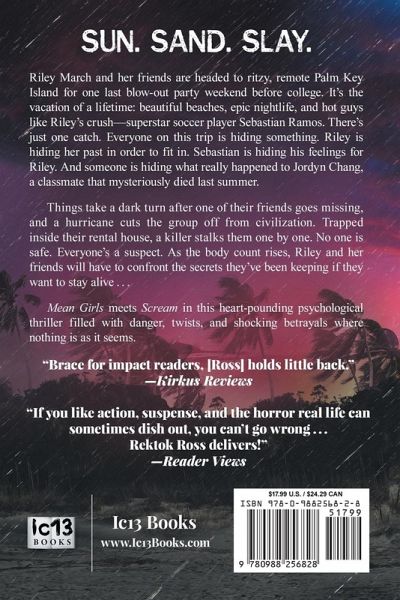 Mean Girls meets Scream in this heart-pounding psychological thriller about a group of friends stranded on an island with a serial killer on the loose. Riley March and her friends are headed to ritzy, remote Palm Key Island for one last blow-out party weekend before college. It's the vacation of a lifetime: beautiful beaches, epic nightlife, and hot guys like Riley's crush-superstar soccer player Sebastian Ramos. There's just one catch. Everyone on this trip is hiding something. Riley is hiding her past in order to fit in. Sebastian is hiding his feelings for Riley. And someone is hiding what really happened to Jordyn Chang, a classmate that mysteriously died last summer. Things take a dark turn after one of their friends goes missing, and a hurricane cuts the group off from civilization. Trapped inside their rental house, a killer stalks them one by one. No one is safe. Everyone's a suspect. As the body count rises, Riley and her friends will have to confront the secrets they've been keeping if they want to stay alive... Bestselling, award-winning author Rektok Ross returns with this riveting beach read perfect for fans of:Unputdownable and fast-paced thrillers, murder mystery books, and suspense romance fiction Summer books and vacation reads Stories that make you think like Reese Witherspoon book club books Colleen Hoover meets Pretty Little Liars Bingeworthy TikTok books Natasha Preston, Lucy Foley, Holly Jackson, James Patterson, and Frieda McFadden novels