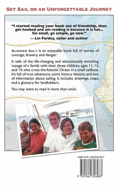 Sailing the Atlantic with Three Children Summer Salt tells of the life-changing and educationally enriching voyage of a family with their three children, ages 11, 13 and 14, who cross the Atlantic Ocean in a small sailboat. It's full of true adventure, some history lessons, and lots of information about sailing. It includes drawings, maps, and a glossary for landlubbers. Summer Salt is an enjoyable book full of stories of courage, bravery, and danger. You may want to read it more than once.