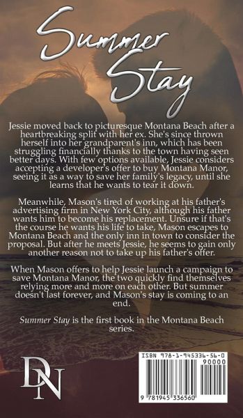 Jessie moved back to picturesque Montana Beach after a heartbreaking split with her ex. She's since thrown herself into her grandparent's inn, which has been struggling financially thanks to the town having seen better days. With few options available, Jessie considers accepting a developer's offer to buy Montana Manor, seeing it as a way to save her family's legacy, until she learns that he wants to tear it down. Meanwhile, Mason's tired of working at his father's advertising firm in New York City, although his father wants him to become his replacement. Unsure if that's the course he wants his life to take, Mason escapes to Montana Beach and the only inn in town to consider the proposal. But after he meets Jessie, he seems to gain only another reason not to take up his father's offer. When Mason offers to help Jessie launch a campaign to save Montana Manor, the two quickly find themselves relying more and more on each other. But summer doesn't last forever, and Mason's stay is coming to an end. Summer Stay is the first book in the Montana Beach series.