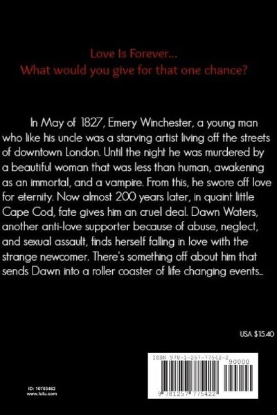 The first novel of The Venantium Auallonia Trilogy In May of 1827, Emery Winchester, a young man who like his uncle was a starving artist living off the streets of downtown London. Until the night he was murdered by a beautiful woman that was less than human, awakening as an immortal, and a vampire. From this, he swore off love for eternity. Now almost 200 years later, in quaint little Cape Cod, fate gives him an cruel deal. Dawn Waters, another anti-love supporter because of abuse, neglect, and sexual assault, finds herself falling in love with the strange newcomer. There's something off about him that sends Dawn into a roller coaster of life changing events...