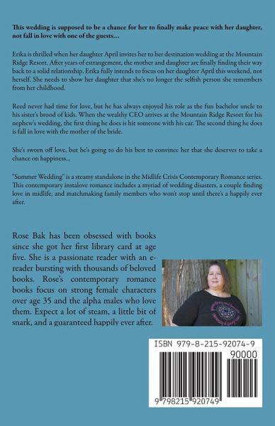 This wedding is supposed to be a chance for her to finally make peace with her daughter, not fall in love with one of the guests… Erika is thrilled when her daughter April invites her to her destination wedding at the Mountain Ridge Resort. After years of estrangement, the mother and daughter are finally finding their way back to a solid relationship. Erika fully intends to focus on her daughter April this weekend, not herself. She needs to show her daughter that she's no longer the selfish person she remembers from her childhood. Reed never had time for love, but he has always enjoyed his role as the fun bachelor uncle to his sister's brood of kids. When the wealthy CEO arrives at the Mountain Ridge Resort for his nephew's wedding, the first thing he does is hit someone with his car. The second thing he does is fall in love with the mother of the bride. She's sworn off love, but he's going to do his best to convince her that she deserves to take a chance on happiness... "Summer Wedding" is a steamy standalone in the Midlife Crisis Contemporary Romance series. This contemporary instalove romance includes a myriad of wedding disasters, a couple finding love in midlife, and matchmaking family members who won't stop until there's a happily ever after.