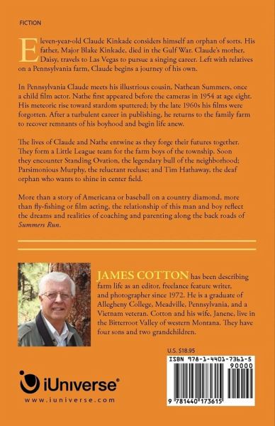 Eleven-year-old Claude Kinkade considers himself an orphan of sorts. His father, Major Blake Kinkade, died in the Gulf War. Claude's mother, Daisy, travels to Las Vegas to pursue a singing career. Left with relatives on a Pennsylvania farm, Claude begins a journey of his own. In Pennsylvania Claude meets his illustrious cousin, Nathean Summers, the family's golden boy. Nathe first appeared before the cameras in 1954 at age eight. His meteoric rise toward stardom sputtered; by the late 1960s his films were forgotten. After a turbulent career in publishing, he returns to the family farm to recover remnants of his boyhood and begin life anew in Summers Run. Claude's and Nathe's lives entwine as they forge their futures together. They form a Little League team for the farm boys of the township. Soon they encounter Standing Ovation, the legendary bull of the neighborhood; Parsimonious Murphy, the reluctant recluse; and Tim Hathaway, the deaf orphan who wants to shine in center field. More than a story of Americana or baseball on a country diamond, more than fly-fishing or film acting, Summers Run mirrors the larger issues of decisions, expectations, and the dreams and realities found along the back roads.