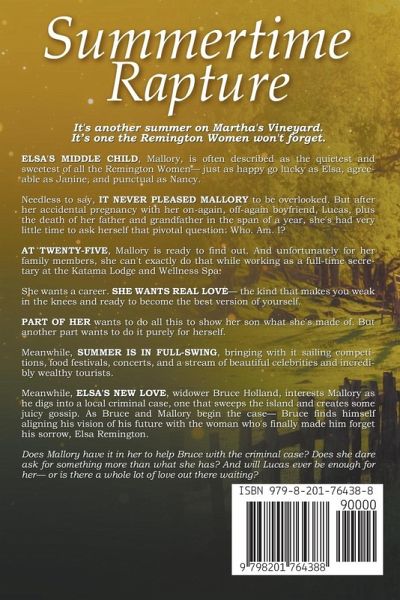 It's another summer on Martha's Vineyard. It's one the Remington Women will won't forget. Elsa's middle child, Mallory, is often described as the quietest and sweetest of all the Remington Women-- just as happy go lucky as Elsa, agreeable as Janine, and punctual as Nancy. Needless to say, it never pleased Mallory to be overlooked. But after her accidental pregnancy with her on-again, off-again boyfriend, Lucas, plus the death of her father and grandfather in the span of a year, she's had very little time to ask herself that pivotal question: Who. Am. I? At twenty-five, Mallory is ready to find out. And unfortunately for her family members, she can't exactly do that while working as a full-time secretary at the Katama Lodge and Wellness Spa. She wants a career. She wants real love-- the kind that makes you weak in the knees and ready to become the best version of yourself. Part of her wants to do all this to show her son what she's made of. But another part wants to do it purely for herself. Meanwhile, summer is in full-swing, bringing with it sailing competitions, food festivals, concerts, and a stream of beautiful celebrities and incredibly wealthy tourists. Meanwhile, Elsa's new love, widower Bruce Holland, interests Mallory as he digs into a local criminal case, one that sweeps the island and creates some juicy gossip. As Bruce and Mallory begin the case-- Bruce finds himself aligning his vision of his future with the woman who's finally made him forget his sorrow, Elsa Remington. Does Mallory have it in her to help Bruce with the criminal case? Does she dare ask for something more than what she has? And will Lucas ever be enough for her-- or is there a whole lot of love out there waiting? Dive into book eight of The Katama Bay Series. A heartwarming journey of motherly and sisterly love, healing, and promise for better days, all on the island of Martha's Vineyard, with its gorgeous ocean views, its endless summer days, and its bubbly cast of islanders.