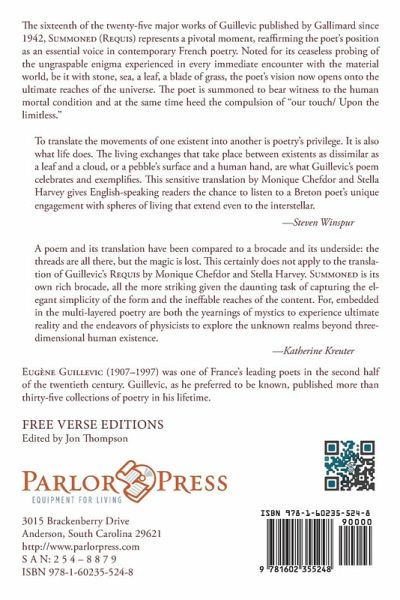 FREE VERSE EDITIONS, Edited by JON THOMPSON   In English and French. The sixteenth of the twenty-five major works of Guillevic published by Gallimard since 1942, SUMMONED (REQUIS) represents a pivotal moment, reaffirming the poet's position as an essential voice in contemporary French poetry. Noted for its ceaseless probing of the ungraspable enigma experienced in every immediate encounter with the material world, be it with stone, sea, a leaf, a blade of grass, the poet's vision now opens onto the ultimate reaches of the universe. The poet is summoned to bear witness to the human mortal condition and at the same time heed the compulsion of "our touch/ Upon the limitless."   "To translate the movements of one existent into another is poetry's privilege. It is also what life does. The living exchanges that take place between existents as dissimilar as a leaf and a cloud, or a pebble's surface and a human hand, are what Guillevic's poem celebrates and exemplifies. This sensitive translation by Monique Chefdor and Stella Harvey gives English-speaking readers the chance to listen to a Breton poet's unique engagement with spheres of living that extend even to the interstellar." -STEVEN WINSPUR   "A poem and its translation have been compared to a brocade and its underside: the threads are all there, but the magic is lost. This certainly does not apply to the translation of Guillevic's REQUIS by Monique Chefdor and Stella Harvey. SUMMONED is its own rich brocade, all the more striking given the daunting task of capturing the elegant simplicity of the form and the ineffable reaches of the content. For, embedded in the multi-layered poetry are both the yearnings of mystics to experience ultimate reality and the endeavors of physicists to explore the unknown realms beyond three-dimensional human existence." -KATHERINE KREUTER   EUGÈNE GUILLEVIC (1907-1997) was one of France's leading poets in the second half of the twentieth century. Guillevic, as he preferred to be known, published more than thirty-five collections of poetry in his lifetime.   MONIQUE CHEFDOR, formerly professor of French and Comparative Literature at Scripps College, Claremont University Center, California, and Maître de Conférences in Comparative Literature at the University of Picardie Jules Verne, France, has published extensively on 20th century French literature, notably on Cendrars, Proust, Segalen, Guillevic and the relationship between painters and writers.   STELLA HARVEY is the author of a monograph Myth and the Sacred in the Poetry of Guillevic (Amsterdam-Atlanta: Rodopi, 1997) and has published a number of articles on Guillevic, the most recent of which appear in Guillevic maintenant (Paris: Honoré Champion, 2011) and Notes Guillevic Notes (Vol. I , Fall/Automne, 2011). She has also published in the field of applied linguistics. She is a lecturer in the Centre for English Language and Academic Writing at Goldsmiths University of London.   LUCIE ALBERTINI GUILLEVIC, the poet's widow, is a writer and translator. Her collaborations as a translator have introduced to major French publishers (Maurice Nadeau, Gallimard, Actes Sud, Arfuyen) some forty Swedish and Finnish writers.