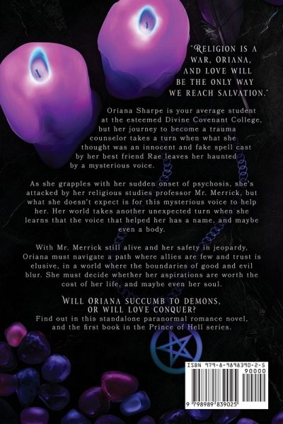 "Religion is a war, Oriana, and love will be the only way we reach salvation." Oriana Sharpe is your average student at the esteemed Divine Covenant College, but her journey to become a trauma counselor takes a turn when what she thought was an innocent and fake spell cast by her best friend Rae leaves her haunted by a mysterious voice. As she grapples with her sudden onset of psychosis, she's attacked by her religious studies professor Mr. Merrick, but what she doesn't expect is for this mysterious voice to help her. Her world takes another unexpected turn when she learns that the voice that helped her has a name, and maybe even a body. With Mr. Merrick still alive and her safety in jeopardy, Oriana must navigate a path where allies are few and trust is elusive, in a world where the boundaries of good and evil blur. She must decide whether her aspirations are worth the cost of her life, and maybe even her soul. Will Oriana succumb to demons, or will love conquer? Find out in this standalone paranormal romance novel, and the first book in the Prince of Hell series.