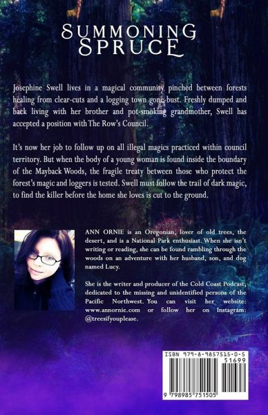 In SUMMONING SPRUCE, Josephine Swell lives in a magical community pinched between forests healing from clear-cuts and a logging town gone-bust. Freshly dumped and back living with her brother and pot-smoking grandmother, Swell has accepted a job with The Row's Council. It's now her job to follow up on all illegal magics practiced within council territory. But when the body of a young woman is found inside the boundary of the Mayback Woods, the fragile treaty between those who protect the forest's magic and loggers is tested. Swell must follow the trail of dark magic, to find the killer before the home she loves is cut to the ground. ANN ORNIE is an Oregonian, lover of old trees, the desert, and is a National Park enthusiast. When she isn't writing or reading she can be found rambling through the woods on an adventure with her husband, son, and dog named Lucy. She is the writer and producer of the Cold Coast Podcast, dedicated to the missing and unidentified persons of the Pacific Northwest. You can visit her website at: www.annornie.com or follow her on Instagram: @treesifyouplease.
