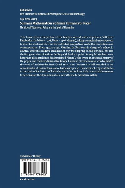 This book revises the picture of the teacher and educator of princes, Vittorino Rambaldoni da Feltre (c. 1378, Feltre -- 1446, Mantua), taking a completely new approach to show his work and life from the individual perspectives created by his students and contemporaries. From 1423 to 1446, Vittorino da Feltre was in charge of a school in Mantua, where his students included not only the offspring of Italy's princes, but also the first generation of authors dealing with books in print. Among his students were historians like Bartolomeo Sacchi (named Platina), who wrote an extensive history of the popes, and mathematicians like Jacopo Cassiano (Cremonensis), who translated the work of Archimedes from Greek into Latin. Vittorino is still regarded as the educationalist of Italian Renaissance humanism per sé. This work not only contributes to the study of the history of Italian humanist institutions, it also uses available sources to demonstrate the development of a new attitude to education in Italy.