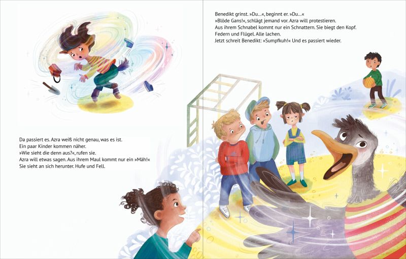 Azra spielt am liebsten im Sandkasten - bis Benedikt sie ärgert und eine SUMPFKUH nennt. Da passiert etwas Seltsames: Azra verwandelt sich tatsächlich in eine Kuh - wie peinlich! Niam und Sophia sehen auch anders aus: Sie haben sich nach Beschimpfungen ebenfalls in Tiere verwandelt. Doch die drei Kinder wissen sich zu helfen und wenden die Worte in etwas Positives um: So verwandeln sie sich gegenseitig in eine kluge Zauberin, einen wilden Drachen und einen gefährlichen Tiger. Als die drei sich mutig den Sandkasten zurückerobern, zeigt sich, dass auch Benedikt nicht immer der ist, der er zu sein scheint ...