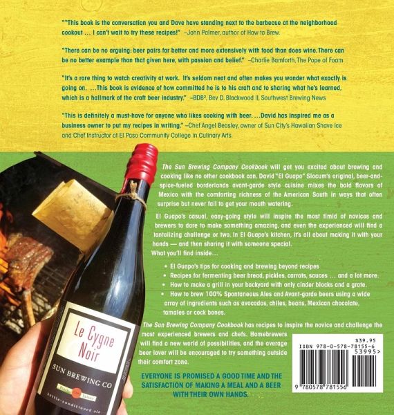"This book is the conversation you and Dave have standing next to the barbecue at the neighborhood cookout ... I can't wait to try these recipes!" - John Palmer, author of How to Brew. "There can be no arguing: beer pairs far better and more extensively with food than does wine. There can be no better example than that given here, with passion and belief." - Charlie Bamforth - The Pope of Foam "It's a rare thing to watch creativity at work. It's seldom neat and often makes you wonder what exactly is going on. ...This book is evidence of how committed he is to his craft and to sharing what he's learned, which is a hallmark of the craft beer industry." - BDB² - Bev D. Blackwood II - Southwest Brewing News "This is definitely a must-have for anyone who likes cooking with beer. ...David has inspired me as a business owner to put my recipes in writing." - Chef Angel Beasley owner of Sun City's Hawaiian Shave Ice and Chef Instructor at El Paso Community College in Culinary Arts. The Sun Brewing Cookbook will get you excited about brewing and cooking like no other cookbook can. David "El Guapo" Slocum's original, beer-and-spice-fueled borderlands avant-garde style cuisine mixes the bold flavors of Mexico with the comforting richness of the American South in ways that often surprise but never fail to get your mouth watering. El Guapo's casual, easy-going style will inspire the most timid of novices and brewers to dare to make something amazing, and even the experienced will find a tantalizing challenge or two. In El Guapo's kitchen, it's all about making it with your hands - and then sharing it with someone special. What you'll find inside... - El Guapo's tips for cooking and brewing beyond recipes - Recipes for fermenting beer bread, pickles, carrots, sauces ... and a lot more. - How to make a grill in your backyard with only cinder blocks and a grate. - How to brew 100% Spontaneous Ales and Avant-garde beers using a wide array of ingredients such as avocados, chiles, beans, Mexican chocolate, tamales or cock bones. The Sun Brewing Company Cookbook has recipes to inspire the novice and challenge the most experienced brewers and chefs. Homebrewers will find a new world of possibilities, and the average beer lover will be encouraged to try something outside their comfort zone. Everyone is promised a good time and the satisfaction of making a meal and a beer with their own hands.