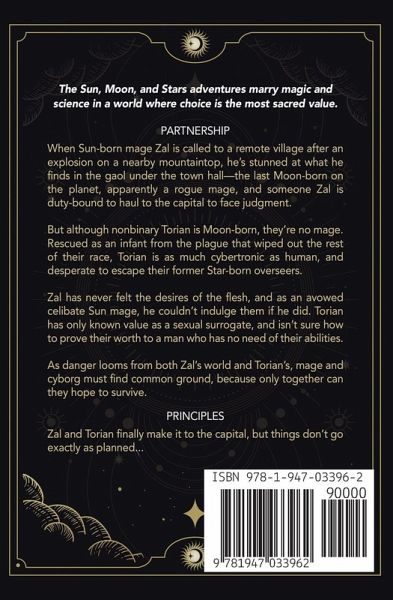The Sun, Moon, and Stars adventures marry magic and science in a world where choice is the most sacred value. Partnership When Sun-born mage Zal is called to a remote village after an explosion on a nearby mountaintop, he's stunned at what he finds in the gaol under the town hall-the last Moon-born on the planet, apparently a rogue mage, and someone Zal is duty-bound to haul to the capital to face judgment. But although nonbinary Torian is Moon-born, they're no mage. Rescued as an infant from the plague that wiped out the rest of their race, Torian is as much cybertronic as human, and desperate to escape their former Star-born overseers. Zal has never felt the desires of the flesh, and as an avowed celibate Sun mage, he couldn't indulge them if he did. Torian has only known value as a sexual surrogate, and isn't sure how to prove their worth to a man who has no need of their abilities. As danger looms from both Zal's world and Torian's, mage and cyborg must find common ground, because only together can they hope to survive. Principles Zal and Torian finally make it to the capital, but things don't go exactly as planned...