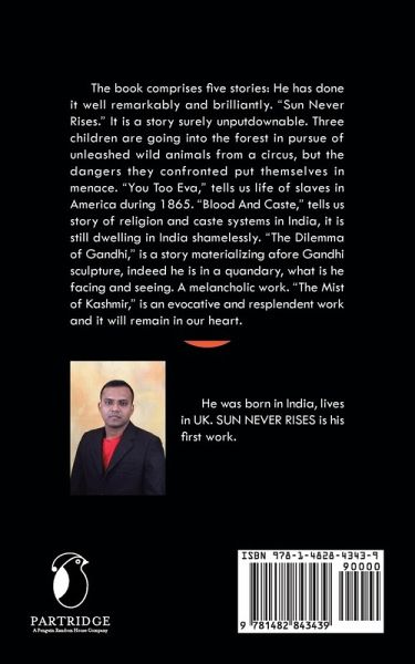 The book comprises five stories: He has done it well remarkably and brilliantly. "Sun Never Rises." It is a story surely unputdownable. Three children are going into the forest in pursue of unleashed wild animals from a circus, but the dangers they confronted put themselves in menace. "You Too Eva," tells us life of slaves in America during 1865. "Blood And Caste," tells us story of religion and caste systems in India, it is still dwelling in India shamelessly. "The Dilemma of Gandhi," is a story materializing afore Gandhi sculpture, indeed he is in a quandary, what is he facing and seeing. A melancholic work. "The Mist of Kashmir," is an evocative and resplendent work and it will remain in our heart.