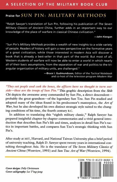 The enormous recent popularity in America of Sun-tzu's Art of War has heightened awareness of the great Chinese tradition of writing on theory and practice of war. This tradition has always emphasized that warfare is as much the deployment of spiritual and mental forces as of combat forces, as much a matter of patience and attention as of brute strength. As a result, new generations of readers have found many of its precepts applicable to forms of struggle far from any actual battlefield.While it has brought this tradition greater exposure, the reception of Art of War threatens to overshadow and obscure the other significant texts that followed in its wake. Foremost among these is Military Methods of the Art of War, written in the fourth century B.C. by the purported great-grandson of Sun-tzu, the general Sun Pin. Military Methods is both an extension of the strategic philosophy of the earlier work and a development of a new strategic style--one that enabled Sun Pin to guide the armies of the province of Ch'i to decisive victories over their enemies in the battles of Kuei-ling and Ma-ling.Long believed lost, the text of Military Methods was recovered from a Han dynasty tomb in 1972. The salvaged original, fragmentary in nature, is divided into thirty-three sections covering such topics as unfavorable terrains, the origins of war, "guest" and "host" armies, "male" and "female" cities, and the ten strategic uses of cavalry. To bridge the gaps in the original, translator Ralph D. Sawyer, the leading authority on Chinese military history and its major texts, has provided extensive commentary and notes, as well as a detailed historical introduction.