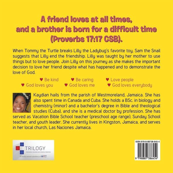 A friend loves at all times, and a brother is born for a difficult time (Proverbs 17:17 CSB). When Tommy the Turtle breaks Lilly the Ladybug's favorite toy, Sam the Snail suggests that Lilly end the friendship. Lilly was taught by her mother to use things but to love people. Join Lilly on this journey as she makes the important decision to love her friend despite what has happened and to demonstrate the love of God. * Be kind * Be caring * Love people * God loves you * God loves me * God loves everybody