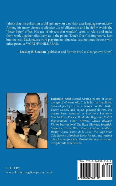Benjamin Nash started writing poetry at about the age of 40 years old. This is his first published book of poetry. He is a member of the Austin Poetry Society and enjoys growing flowers. His poems have appeared in Louisiana Literature, Concho River Review, Pembroke Magazine, Kestrel, Illuminations, VOLT, RHINO, 2River, Blueline, Visions International, The Texas Observer, Streetlight Magazine, Green Hills Literary Lantern, Southern Poetry Review, Voices de la Luna, The Cape Rock, Tule Review, Hamilton Stone Review, and various other literary journals. Most of his poems are about everyday life experiences.