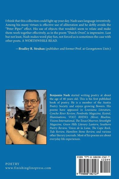 Benjamin Nash first became interested in poetry in a class at the University of Houston. It was years later that he started to write. At some point he decided that he wanted to share his poetry. This book is his opportunity. Most of these poems are about his life in Texas, the blend of rural and city life, and the struggles we all face.
