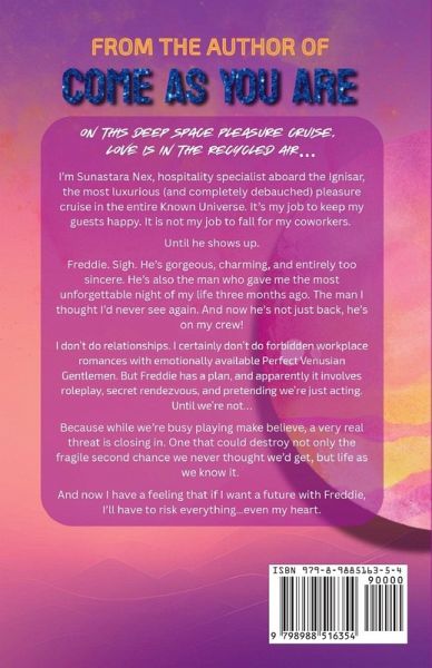 On this deep space pleasure cruise, love is in the recycled air... I'm Sunastara Nex, hospitality specialist aboard the Ignisar, the most luxurious (and completely debauched) pleasure cruise in the entire Known Universe. It's my job to keep my guests happy. It is not my job to fall for my coworkers. Until he shows up. Freddie. Sigh. He's gorgeous, charming, and entirely too sincere. He's also the man who gave me the most unforgettable night of my life three months ago. The man I thought I'd never see again. And now he's not just back, he's on my crew! I don't do relationships. I certainly don't do forbidden workplace romances with emotionally available Perfect Venusian Gentlemen. But Freddie has a plan, and apparently it involves roleplay, secret rendezvous, and pretending we're just acting. Until we're not... Because while we're busy playing make believe, a very real threat is closing in. One that could destroy not only the fragile second chance we never thought we'd get, but life as we know it. And now I have a feeling that if I want a future with Freddie, I'll have to risk everything...even my heart. Perfect for fans of Ruby Dixon and steamy sci-fi romance, second chances, forced proximity, slow burn heat, found family goodness, and a happily ever after worth fighting for.