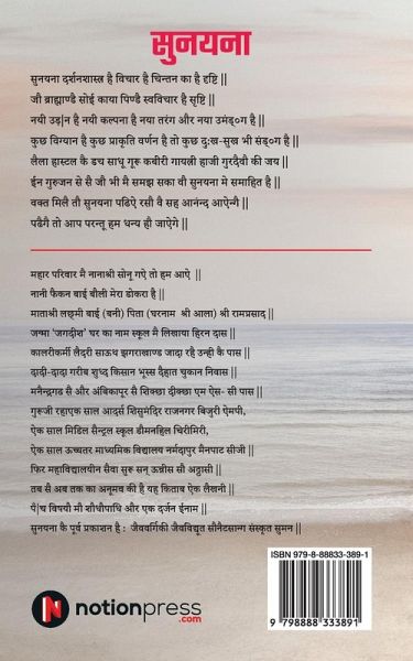 Sunayana means Beautiful Eyes. Thus 'tis Vision or Philosophy. Whatever Inner feelings ditto looks like society. This book carries innovation and motivation New waves of thinking and a new hypothesis. Some are science poems some are natural descriptions. Some happiness and sadness also are some love songs. Dutch Warden of Loyola Hostel, Muslim Professors My Society, Gayatri Mission, and Vaidic Philosophers. From these what I could read and learn are included in this book. If you read it, I shall be thankful. I believe that Reading Sunayana will be full of enjoyment. Author (Dr.H D Mahar)