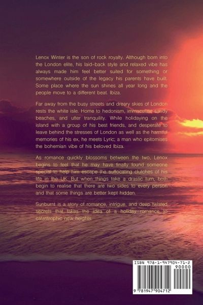 Lenox Winter is the son of rock royalty. Although born into the London elite, his laid-back style and relaxed vibe has always made him feel better suited for something or somewhere outside of the legacy his parents have built. Some place where the sun shines all year long and the people move to a different beat. Ibiza. Far away from the busy streets and dreary skies of London rests the white isle. Home to hedonism, immaculate sandy beaches, and utter tranquility. While holidaying on the island with a group of his best friends, and desperate to leave behind the stresses of London as well as the harmful memories of his ex, he meets Lyric; a man who epitomises the bohemian vibe of his beloved Ibiza. As romance quickly blossoms between the two, Lenox begins to feel that he may have finally found someone special to help him escape the suffocating clutches of his life in the UK. But when things take a drastic turn, both begin to realise that there are two sides to every person and that some things are better kept hidden. Sunburnt is a story of romance, intrigue, and deep twisted secrets that takes the idea of a holiday romance to catastrophic new heights.
