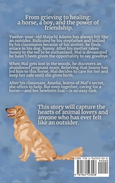 From grieving to healing: a horse, a boy, and the power of friendship. Twelve-year-old Malachi Adams has always felt like an outsider. Ridiculed by his stepfather and bullied by his classmates because of his stutter, he finds solace in his dog, Sunny. After his mother takes Sunny to the vet to be euthanized, Mal is devastated he hasn't been given the opportunity to say goodbye. When Mal gets lost in the woods, he discovers an abandoned pregnant mare. Believing that Sunny has led him to this horse, Mal decides to care for her and keep her safe until she gives birth. After his classmate, Amelia, learns of Mal's secret, she offers to help. But even together, caring for a horse-and her newborn foal-is no easy task. This story will capture the hearts of animal lovers and anyone who has ever felt like an outsider.