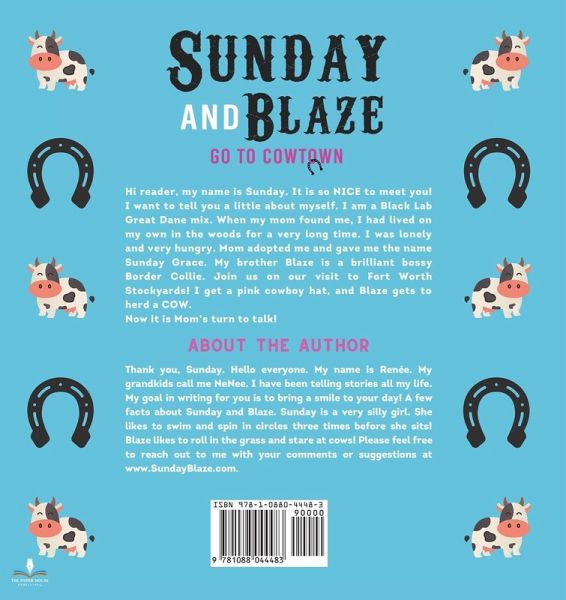 Hi reader, my name is Sunday. It is so NICE to meet you! I want to tell you a little about myself. I am a Black Lab Great Dane mix. When my mom found me, I had lived on my own in the woods for a very long time. I was lonely and very hungry. Mom adopted me and gave me the name Sunday Grace. My brother Blaze is a brilliant bossy Border Collie. Join us on our visit to Fort Worth Stockyards! I get a pink cowboy hat, and Blaze gets to herd a COW. Now it is Mom's turn to talk! Thank you, Sunday. Hello everyone. My name is Renée. My grandkids call me NeNee. I have been telling stories all my life. My goal in writing for you is to bring a smile to your day! A few facts about Sunday and Blaze. Sunday is a very silly girl. She likes to swim and spin in circles three times before she sits! Blaze likes to roll in the grass and stare at cows! Please feel free to reach out to me with your comments or suggestions at www.SundayBlaze.com.