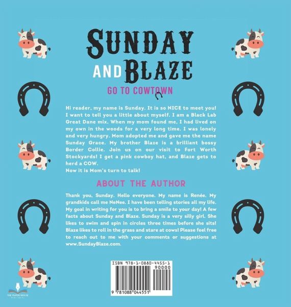 Hi reader, my name is Sunday. It is so NICE to meet you! I want to tell you a little about myself. I am a Black Lab Great Dane mix. When my mom found me, I had lived on my own in the woods for a very long time. I was lonely and very hungry. Mom adopted me and gave me the name Sunday Grace. My brother Blaze is a brilliant bossy Border Collie. Join us on our visit to Fort Worth Stockyards! I get a pink cowboy hat, and Blaze gets to herd a COW. Now it is Mom's turn to talk! Thank you, Sunday. Hello everyone. My name is Renée. My grandkids call me NeNee. I have been telling stories all my life. My goal in writing for you is to bring a smile to your day! A few facts about Sunday and Blaze. Sunday is a very silly girl. She likes to swim and spin in circles three times before she sits! Blaze likes to roll in the grass and stare at cows! Please feel free to reach out to me with your comments or suggestions at www.SundayBlaze.com.
