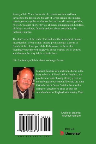Sunday Club! Yes it does exist. In countless clubs and bars throughout the length and breadth of Great Britain like-minded people gather together to discuss the latest world events, politics, religion, weather, sport, movies, children, grandchildren, holidays, birthdays, weddings, funerals and just about everything else including murder. The discovery of the body of a child and the subsequent murder investigation, is but a small talking point amongst a group of friends at their local golf club. Unbeknown to them, this seemingly unconnected tragedy is about to spiral out of control and threaten the very fabric of their lives. Life for Sunday Club is about to change forever.