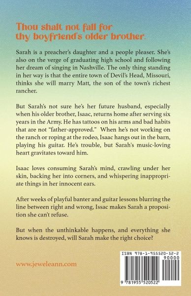 A small-town, forbidden, standalone, new adult romance with Footloose meets A Star is Born vibes from USA Today & Wall Street Journal Bestselling author Jewel E. Ann Her boyfriend's older brother should be off-limits, but he's a sinful temptation. Sarah is a preacher's daughter and a people pleaser. She's also on the verge of graduating high school and following her dream of singing in Nashville. The only thing standing in her way is that the entire town of Devil's Head, Missouri, thinks she will marry Matt, the son of the town's richest rancher. But Sarah's not sure he's her future husband, especially when his older brother, Isaac, returns home after serving six years in the Army. He has tattoos on his arms and bad habits that are not "father-approved." When he's not working on the ranch or roping at the rodeo, Isaac hangs out in the barn, playing his guitar. He's trouble, but Sarah's music-loving heart gravitates toward him. Isaac loves consuming Sarah's mind, crawling under her skin, backing her into corners, and whispering inappropriate things in her innocent ears. After weeks of playful banter and guitar lessons blurring the line between right and wrong, Issac makes Sarah a proposition she can't refuse. But when the unthinkable happens, and everything she knows is destroyed, will Sarah make the right choice?