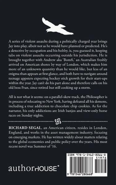 A series of violent assaults during a politically charged year brings Jay into play, albeit not as he would have planned or predicted. He’s a detective by occupation, and his hobby is—you guessed it—keeping tabs on violent assaults occurring outside his jurisdiction. He is brought together with Andrew, a.k.a. ‘Bomfi,’ an Australian freshly arrived on American shores by way of London, which makes him more of an unknown quantity than he would like but less of an enigma than appears at first glance. Both have to navigate around teenage appsters expecting hockey-stick growth for their start-ups within the year. Jay can’t do his part alone and therefore calls on his old boss Fran, who has since retired but still cooking up a storm. All is not what it seems. On a parallel-skew track, the Philosopher is in the process of relocating to New York, having defeated all his demons, including a true addiction to chocolate chip cookies. As for the narrator, his only addictions are Irish banjos and view-only horse races on Sunday nights.