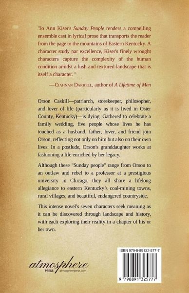 Orson Caskill-patriarch, storekeeper, philosopher, and lover of life (particularly as it is lived in Osier County, Kentucky)-is dying. Gathered to celebrate a family wedding, five people whose lives he has touched as a husband, father, lover, and friend join Orson, reflecting not only on him but also on their own lives. In a postlude, Orson's granddaughter works at fashioning a life enriched by her legacy. Although these "Sunday people" range from Orson to an outlaw and rebel to a professor at a prestigious university in Chicago, they all share a lifelong allegiance to eastern Kentucky's coal-mining towns, rural villages, and beautiful, endangered countryside. This intense novel's seven characters seek meaning as it can be discovered through landscape and history, with each exploring their reality in a chapter of his or her own. "Sunday People is a novel about living and dying. It opens from the first-person viewpoint of Orson Caskill, store owner, philosopher, and family patriarch, whose memories and intentions drive a story of family choices and consequences. From its opening lines, Sunday People embraces a special form of reflective reasoning, allowing its readers to enter Orson's life. . . . Readers will appreciate the thoroughly compelling "you are here" focus that brings to life the events shaking Osier County, Kentucky as well as the family's legacy. Readers interested in the experience of Kentucky's coal-mining towns and heritage will especially appreciate how Kiser builds her story around history. . . . Sunday People's passages about Kentucky's evolving culture create a hard-hitting, reflective work that should not be missed." - D. Donovan, Senior Reviewer, Midwest Book Review "Orson Caskill is 68 years old and dying of cancer. Born and raised in Kentucky , , , Orson is now taking stock of his life while at a family wedding. Similarly reflecting on past choices are gathered friends and family members whose respective life paths have all crossed in one way or another. . . . Orson . . . prefers to spend his Sundays at a little cabin overlooking what he refers to as "God's pond." His mortality forces him to consider the choices he made in youth; regarding his family, he "want[s] them to know the truth about [him], whatever that means." ... An emotional read with lyrical prose." - Kirkus Reviews "Sunday People is a deeply intimate portrait of family and generational ties. Kiser does not shy away from tough subjects, instead inundating the work with hard realities and philosophical questions that are difficult to contend with. It is the type of novel that begs further examination and one that would be a joy to re-read for its sharp language, symbols, and structure." -Haley Perry, Independent Book Review "Kiser is an eastern Kentucky native, spending her early days there. The region left an imprint on her. . . . [Sunday People] is the story of Orson Caskill and the people close to him. The author mines her own experiences and memories to weave her tales. . . . One by one our narrators pass along Kiser's story baton. She excavates enduring characters, embroidering their stories with delicacy and emotion." -Vick Mickunas, Book Nook, Dayton Daily News "In Sunday People. . . Osierville residents gather for a wedding. . . . The event launches seven eponymous chapters whose accounts' whole surpasses their singular sum. . . . On Sarvis Mountain, as everywhere, stories tightly bound together remain each teller's own. Eastern Kentucky's parochial and progressive characters honor and defy stereotype, living interesting, human lives." - Jane Blakelock, Yellow Springs News