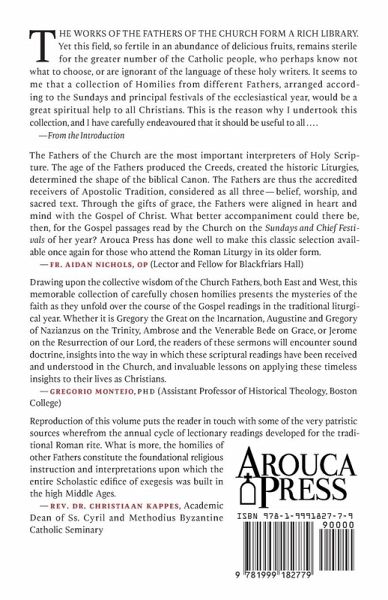 Excerpt from the Foreword: "Study of the authoritative commentators on Sacred Scripture, and most particularly of the pericopes to be read out at the Sacred Liturgy has long been the custom of any of the places and communities where the celebration of the Divine Office or the "Liturgy of the Hours" is celebrated. This is true of the several liturgies of both East and West. Just as in the Old Testament Church, so too in the Church of the New Testament, it was unthinkable to approach the inspired word without some example or gloss or commentary. Thus did St Augustine learn to interpret the Sacred Scriptures, which at first seemed to his fine rhetor's ear to be so lacking in both dignity and content, by listening assiduously to the preaching of St. Ambrose in the cathedral of Milan. Ambrose's homilies struck deep into the heart of the North African seeker, and brought him finally to the instant crisis of his conversion to a life of chastity.... Holy conversation first, then sacred reading on our own (called lectio divina), will fit our hearts to receive the riches of the Fathers and the Holy Gospels. So my advice to you, good reader, is to take up this lovely and useful volume which God in his Providence has placed in your hands and make it a locus of holy conversation with family and friends, fellow seekers of the truth. Holiness and enlightenment come largely to us through our friends of like mind. To be sure, solitude is also needful, but even there we are not alone, but are surrounded, as the Apostle says, 'by a cloud of witnesses.'" - Hugh Barbour, O.Praem. Excerpt from the Introduction: "The works of the Fathers of the Church form a rich library. Yet this field, so fertile in an abundance of delicious fruits, remains sterile for the greater number of the Catholic people, who perhaps know not what to choose, or are ignorant of the language of these holy writers. It seems to me that a collection of Homilies from different Fathers, arranged according to the Sundays and principal festivals of the ecclesiastical year, would be a great spiritual help to all Christians. This is the reason why I undertook this collection, and I have carefully endeavoured that it should be useful to all.... " - Rev. D.G. Hubert