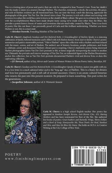 "Step into the captivating world of Sundays and Hot Buttered Rolls: A Granddaughter of Harlem Speaks, a poetic journey masterfully crafted by Carla M. Cherry. This chapbook unfolds like a lyrical tapestry, intricately weaving the vibrant threads of Cherry's heritage. A celebration of her father, a Harlemite, begins a nuanced exploration of the bustling streets and cultural treasures that have shaped her identity. James Van Der Zee's photographic brilliance, the hallowed grounds of the Schomburg Center and Harlem School of the Arts, and the rhythmic pulse of Chicago-style stepping reverberate, becoming a metaphor for the intricate steps of the African diaspora's history in the heart of New York City and beyond. As you traverse this poetic odyssey, anticipate satisfaction akin to the lingering aroma of her paternal grandmother's homemade biscuits on Sundays-a sensory delight that nourishes the soul." -Abiodun Oyewole, Founding Member of The Last Poets