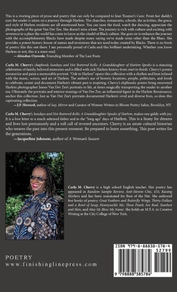 "Step into the captivating world of Sundays and Hot Buttered Rolls: A Granddaughter of Harlem Speaks, a poetic journey masterfully crafted by Carla M. Cherry. This chapbook unfolds like a lyrical tapestry, intricately weaving the vibrant threads of Cherry's heritage. A celebration of her father, a Harlemite, begins a nuanced exploration of the bustling streets and cultural treasures that have shaped her identity. James Van Der Zee's photographic brilliance, the hallowed grounds of the Schomburg Center and Harlem School of the Arts, and the rhythmic pulse of Chicago-style stepping reverberate, becoming a metaphor for the intricate steps of the African diaspora's history in the heart of New York City and beyond. As you traverse this poetic odyssey, anticipate satisfaction akin to the lingering aroma of her paternal grandmother's homemade biscuits on Sundays-a sensory delight that nourishes the soul." -Abiodun Oyewole, Founding Member of The Last Poets