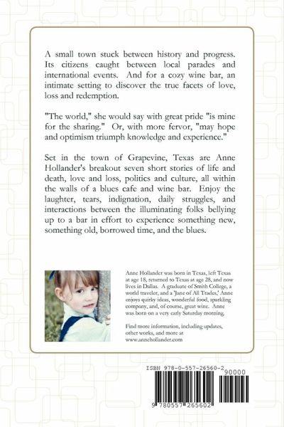 Monday's Child is fair of face; Tuesday's Child is full of grace. Wednesday's Child is full of woe; Thursday's Child has far to go. Friday's Child is loving and giving; Saturday's Child works hard for a living. But the child who is born on the Sabbath Day Is bonny and blithe, merry and gay. A medieval fortune describing the life-long luck one should have by the day of the week one was born illuminates the days within the walls of a small-town Texas wine bar. Each day tells its own story from its own voice and its own set of characters, and though the women are strong and men good-looking, it is nothing but love - in all its forms, uses, and definitions - which bind these stories together, from passionate inception through peaceful retirement.