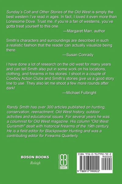 Sunday's Colt and Other Stories of the Old West is simply the best western I've read in ages. In fact, I loved it even more than Lonesome Dove. Trust me, if you're a fan of westerns, you've gotta treat yourself to this one. -Margaret Marr, author Smith's characters and surroundings are described in such a realistic fashion that the reader can actually visualize being there. -Susan Conrady, reader and fan I have done a lost of research on the old west for many years and can tell Smith also put in some work on his locations, clothing, and firearms in his stories. I shoot in a couple of Cowboy Action Clubs and Smith's stories give us a good story line to use-for that they also let me shoot a few more rounds after dark! -Michael Fulbright, Old West reenactor Randy Smith has over 300 articles published on hunting, conservation, reenactment, Old West history, outdoor activities and educational issues. For several years he was a columnist for Old West magazine. His column "Old West Gunsmith" dealt with historical firearms of the 19th century. He is a field editor for Blackpowder Hunting and was a contributing editor for Firearms Quarterly.