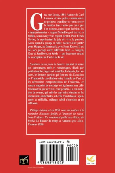 Grez-sur-Loing, 1884. Autour de Carl Larsson vit une petite communaute de peintres scandinaves venus tester la lumiere tant vantee par ceux que l'on nomme, encore par derision, les "impressionistes." August Strindberg est la avec sa famille, Soren Kroyer les rejoint bientot. Pour Ulrick Tercier, ils representent la joie de vivre, la passion. Aussi, quand le groupe se delite, decide-t-il de partir pour Skagen, au Danemark, avec Soren Kroyer. Il est des lors partage entre differents lieux--Skagen, Grez et Sundborn, en Suede--qui incarnent autant de conceptions de l'art et de la vie. "Sundborn ou les jours de lumiere," qui met en scene des personnages reels et romanesques, decrit par petites touches, legeres and sensibles, les heurts, les cassures, les instants parfaits qui font une vie. Evocation de l'impossible conciliation entre l'absolu de l'art et les necessaires compromissions de l'existence, ce roman empreint de nostalgie est egalement une celebration de la joie de vivre, et de peindre. La construction du roman, qui mele les souvenirs lointains et les impressions immediates, est celle d'un tableau: spontanee et reflechie, melange subtil d'emotion et de reflexion.