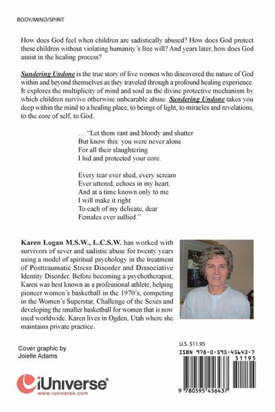 How does God feel when children are sadistically abused? How does God protect these children without violating humanity's free will? And years later, how does God assist in the healing process? Sundering Undone is the true story of five women who discovered the nature of God within and beyond themselves as they traveled through a profound healing experience. It explores the multiplicity of mind and soul as the divine protective mechanism by which children survive otherwise unbearable abuse. Sundering Undone takes you deep within the mind to a healing place, to beings of light, to miracles and revelations, to the core of self, to God. "Let them rant and bloody and shatter But know this: you were never alone for all their slaughtering I hid and protected your core. Every tear ever shed, every scream ever uttered, echoes in my heart. And at a time known only to me I will make it right To each of my delicate, dear Females ever sullied."