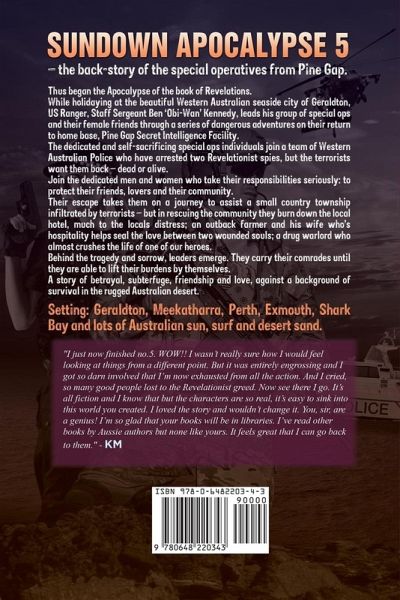 Sundown Apocalypse 5: Special Ops – the back-story of the special operatives from Pine Gap. Thus began the Apocalypse of the book of Revelations. While holidaying at the beautiful Western Australian seaside city of Geraldton, US Ranger, Staff Sergeant Ben ‘Obi-Wan’ Kennedy, leads his group of special ops and their female friends through a series of dangerous adventures on their return to home base, Pine Gap Secret Intelligence Facility. The dedicated and self-sacrificing special ops individuals join a team of Western Australian Police who have arrested two Revelationist spies, but the terrorists want them back – dead or alive. Join the dedicated men and women who take their responsibilities seriously: to protect their friends, lovers and their community. Their escape takes them on a journey to assist a small country township infiltrated by terrorists – but in rescuing the community they burn down the local hotel, much to the locals distress; an outback farmer and his wife who’s hospitality helps seal the love between two wounded souls; a drug warlord who almost crushes the life of one of our heroes. Behind the tragedy and sorrow, leaders emerge. They carry their comrades until they are able to lift their burdens by themselves. A story of betrayal, subterfuge, friendship and love, against a background of survival in the rugged Australian desert. Setting: Geraldton, Meekatharra, Perth, Exmouth, Shark Bay and lots of Australian sun, surf and desert sand. Also in this series by Leo Nix: Sundown Apocalypse Sundown Apocalypse 2: Urban Guerrilla Sundown Apocalypse 3: Homeland Defense Sundown Apocalypse 4: Desert Strike If you enjoyed Devon C Ford's 'After it Happened' series, then this is the series for you - hard-hitting, fast-paced adventure without the fluff. Early reviews: "I just now finished no.5. WOW!! I wasn’t really sure how I would feel looking at things from a different point. But it was entirely engrossing and I got so darn involved that I’m now exhausted from all the action. And I cried, so many good people lost to the Revelationist greed. Now see there I go. It’s all fiction and I know that but the characters are so real, it’s easy to sink into this world you created. I loved the story and wouldn’t change it. You, sir, are a genius! I’m so glad that your books will be in libraries. I’ve read other books by Aussie authors but none like yours. It feels great that I can go back to them." KM "Where do I start? This is the best Sundown Apocalypse novel by far. You have slowly brought the MAIN characters together... Mate, you have scribed a great story. To use an old Naval term, Bravo Zulu (BZ), and well done, a great story, well written." PC Reviews for the Sundown Apocalypse series: "This is an outstanding series... am waiting with baited breath to get all of the books. An outstanding wordsmith...each page jumps alive as you read. Keep up the great work!" GA "Reading this series has been one of the highlights of my life. As an Aussie who has lived in the Northern Territory, I have such wonderful memories of places and people, so much like those Leo Nix has given the reader. The author has created a truly wonderful story that encompasses all that is good, and bad, in human nature. Beginning with the Apocalypse and following groups of people who gradually come together. There is so much to experience that it’s a rush to turn page after page in order to keep up. I dream of maybe a 9 book series, Mr Nix!" KayM