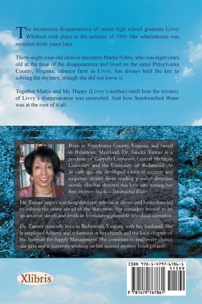 The mysterious disappearance of recent high school graduate Livvy Whitlock took place in the summer of 1960. Her whereabouts was revealed thirty years later. Thirty-eight-year-old interior decorator Mattie Noble, who was eight years old at the time of the disappearance and lived on the same Pittsylvania County, Virginia, tobacco farm as Livvy, has always held the key to solving the mystery, though she did not know it. "Together, Mattie and Ms. Happy (Livvy's mother) . . .retell how the mystery of Livvy's . . . disappearance was unraveled. And how Sundrenched Water was at the root of it all.